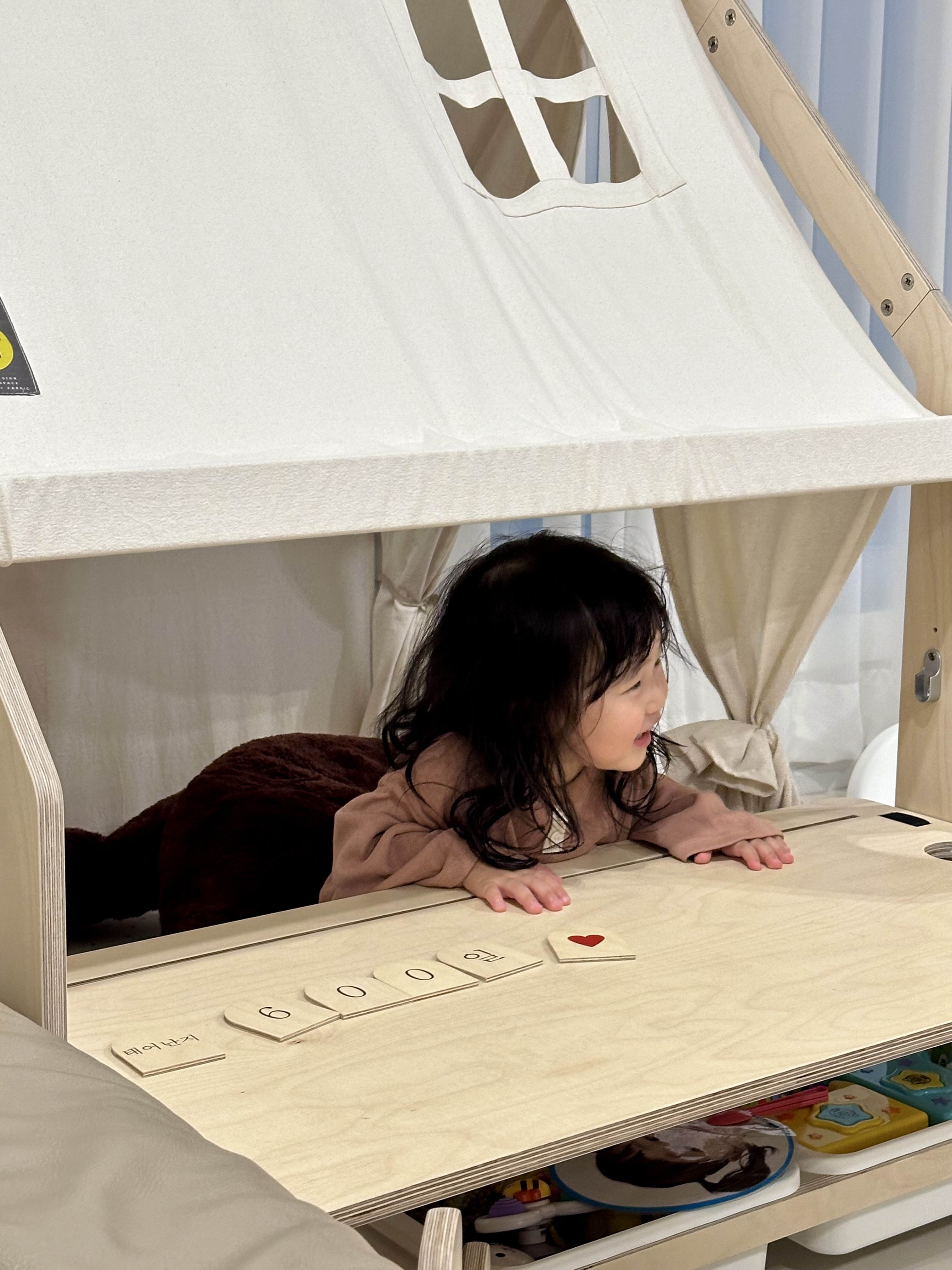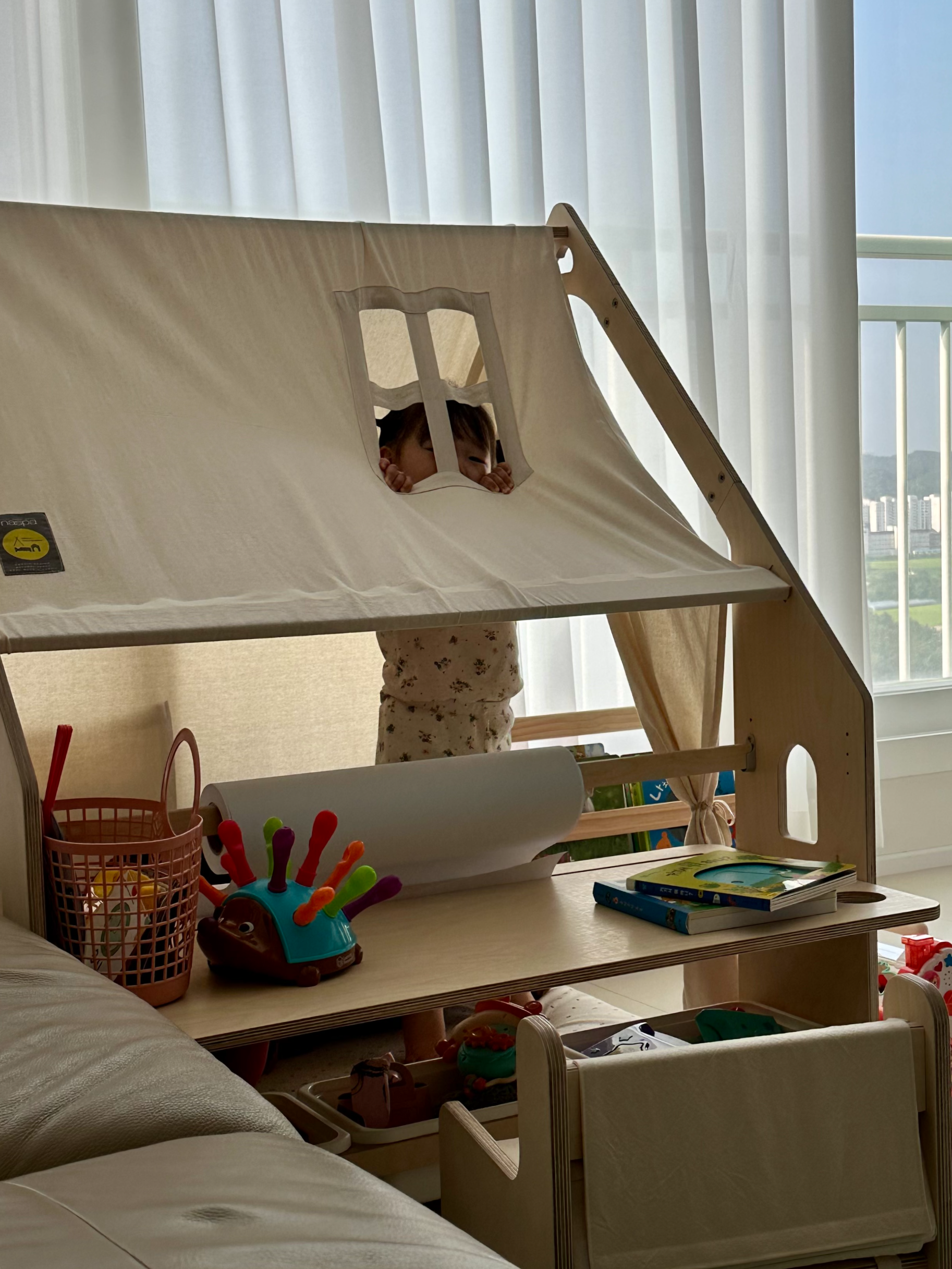 요즘엔 안에 들어가서 혼자 “엄마 빠빠 냠냠~” 하며 소꿉놀이도 해요.