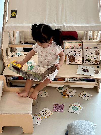 밖에서는 금방 산만해지던 아윤이가, 안에서는 혼자 책도 읽고 인형을 가지고 노는 등 한참을 혼자 놀아요.